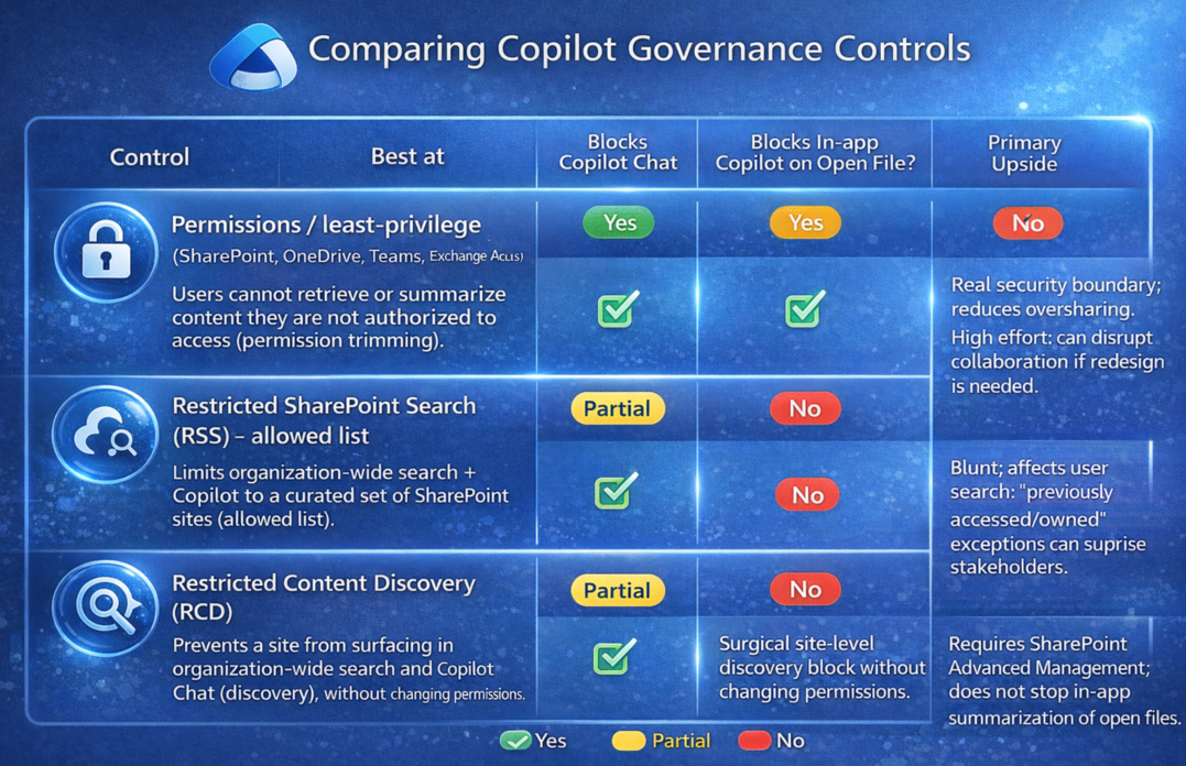 Limit organization-wide search and Copilot retrieval to a curated pilot boundary while broader remediation is underway. |